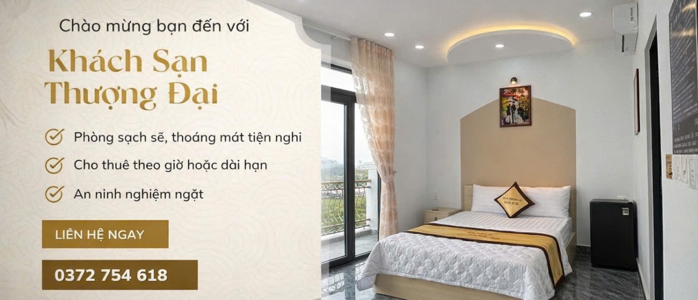Khách sạn Thượng Đại hân hạnh chào đón Quý khách. Chúng tôi mang đến không gian lưu trú sạch sẽ, tiện nghi và yên tĩnh, phù hợp cho khách công tác và lưu trú ngắn – dài ngày. Với đội ngũ nhân viên tận tâm, chu đáo, Thượng Đại luôn nỗ lực đem lại cho Quý khách sự thoải mái và hài lòng trong suốt thời gian lưu trú.